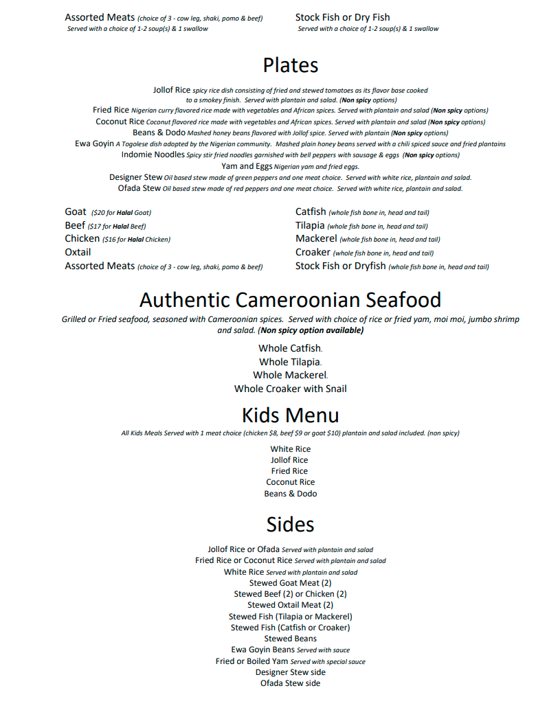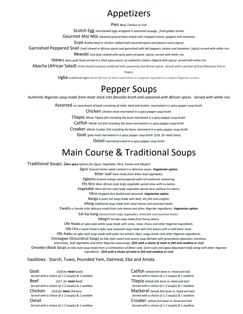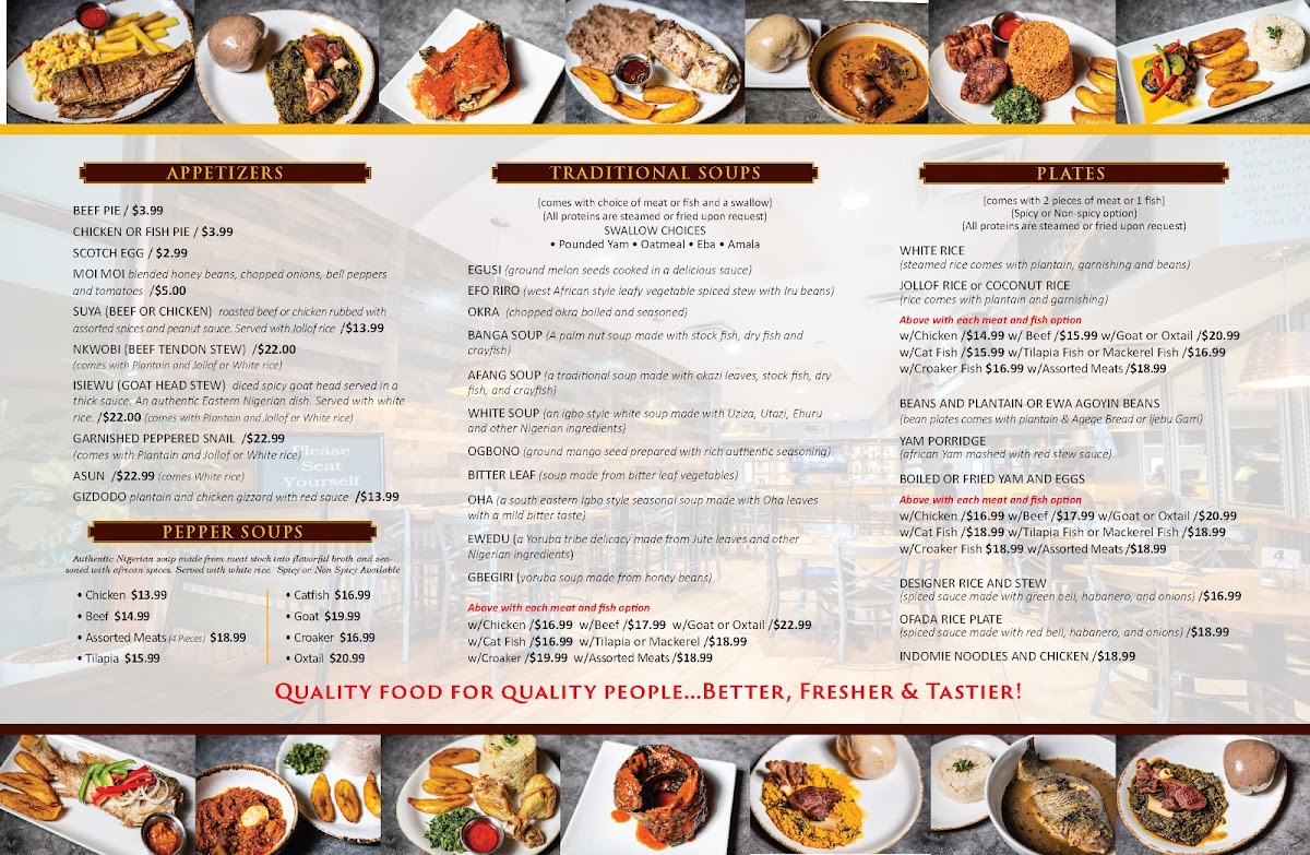 The moment you step inside, you are greeted by a warm and inviting atmosphere that reflects the essence of Nigerian culture. The decor is adorned with traditional elements that set the stage for an immersive dining experience. Whether you're dining in or ordering takeout, the ambiance offers a comforting backdrop to your meal.