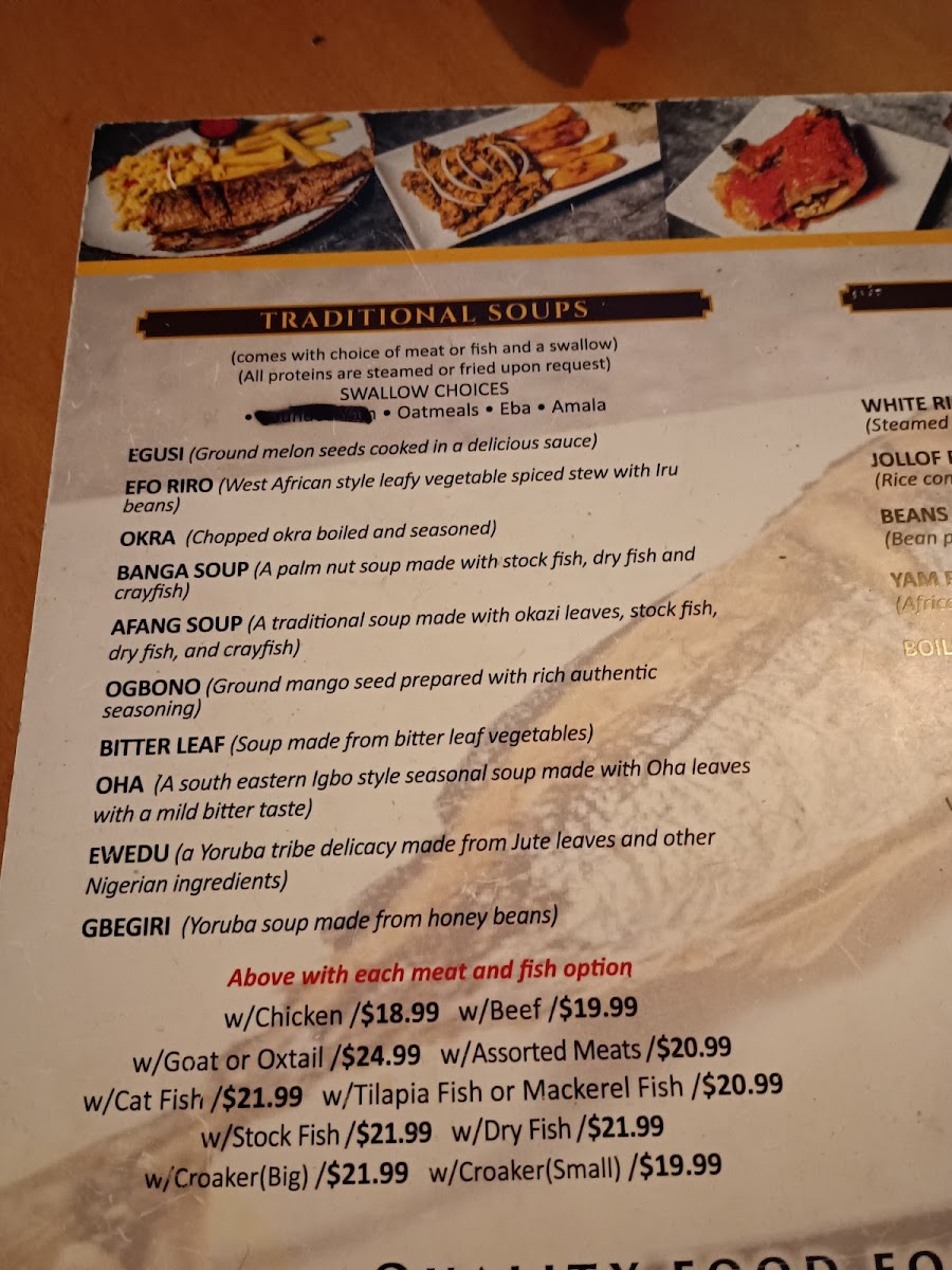 Reviews from patrons reflect a mix of experiences. Customer Ebenezer A. raved about the fantastic service and the delightful taste of their meat pie, reminiscent of nostalgic flavors from Nigeria, while guests like Raven Kimble pointed out areas for improvement, highlighting their experience with the soups. It’s clear from these testimonials that while this culinary gem excels in many areas, there is room for refinement that could elevate guest satisfaction even further.